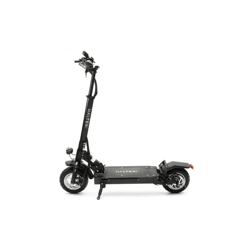 Halten RS-02 станет отличным помощником в передвижении на дальние расстояния, будет без проблем преодолевать участки бездорожья. Диаметр колес 10 дюймов. Его мощности в 1200 Вт хватит, чтоб спокойно подниматься на подъем 20 градусов. Скорость, которую развивает самокат на электротяге составляет 55 км/ч.