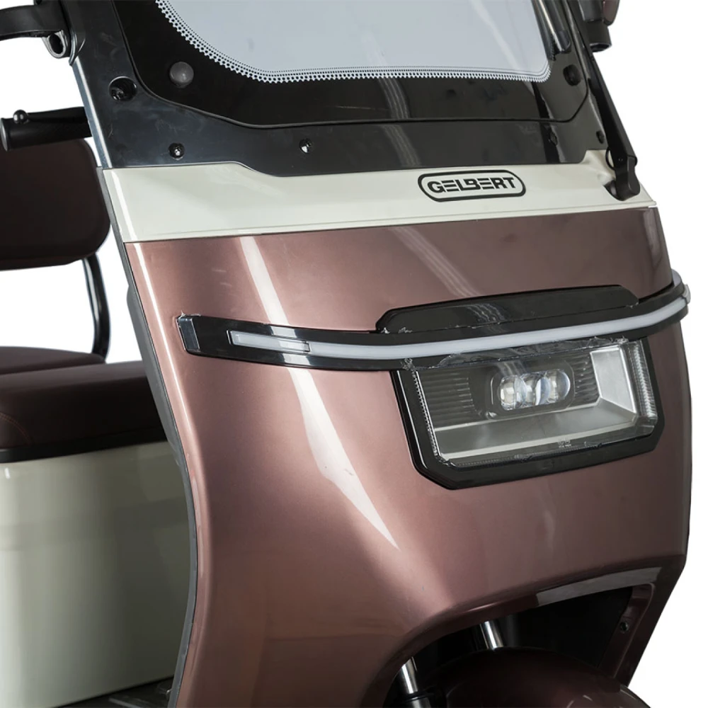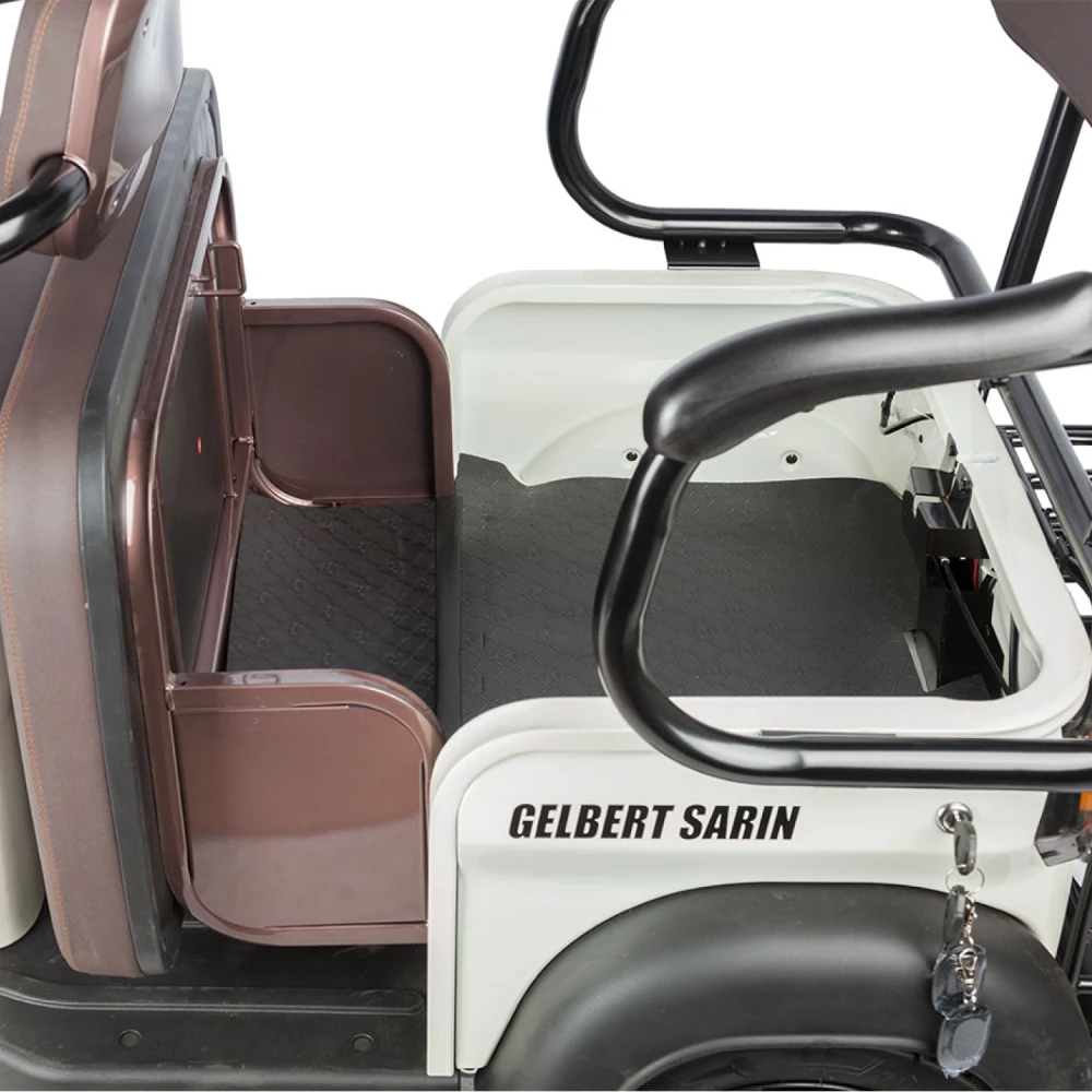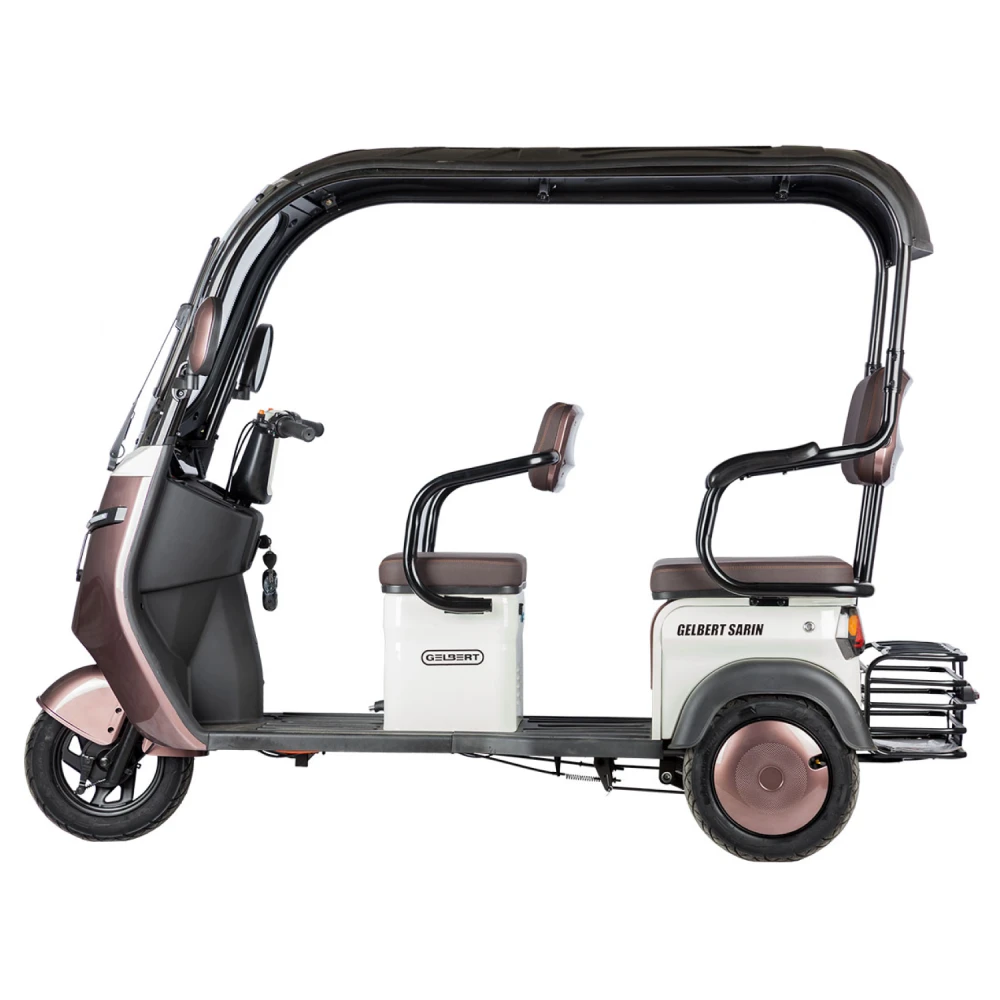 2. Модель Rutrike Gelbert Sarin — трехколесный электротрицикл с мощным двигателем 1000 Вт и возможностью выбора аккумулятора с напряжением 48 или 60 В. Это устойчивый и надежный транспорт, предназначенный для комфортного передвижения по городу и пригородам. Модель оснащена крышей и зеркалами заднего вида, что повышает безопасность и комфорт при эксплуатации.