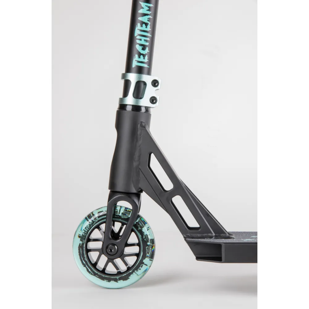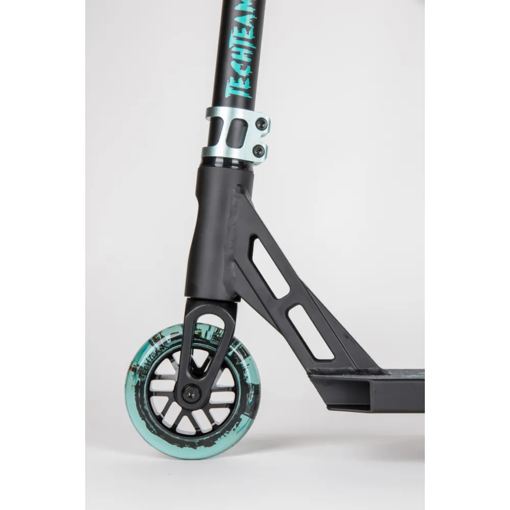 Качественная колесная часть с черно-бирюзовыми полиуретановыми колесами способна сотворить чудеса, выполнять рискованные трюки слушаясь пользователя на 100 %.